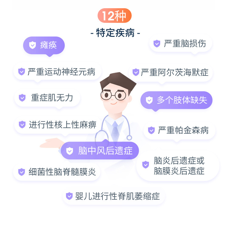 【特定疾病说明】投保“特定疾病失能保险金”责任,可承保12种特定疾病:瘫痪、脑中风后遗症、严重脑损伤、脑炎后遗症或者脑膜炎后遗症、进行性核上性麻痹、严重阿尔茨海默症、严重帕金森病、严重运动神经元病、细菌性脑脊髓膜炎、重症肌无力、婴儿进行性脊肌萎缩症、多个肢体缺失。(详细病种解释见条款)