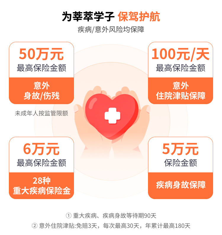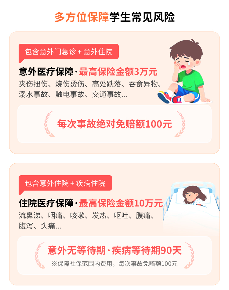 | 学生住院医疗(含意外、疾病) | 5万元 | 保险期间内,被保险人因遭受意外伤害事故或等待期90日后因疾病在中华人民共和国卫生部门评审确定的二级(含)以上的公立医院进行住院治疗,对于其实际发生的必须由被保险人自行承担的按照当地基本医疗保险或其他公费医疗主管部门规定可报销的、必需且合理的床位费、手术费、药费等合理医疗费用,保险人按照保险合同的约定给付保险金。 基础版,升级版:社保范围内赔付,每次事故经社保报销后扣除100元免赔额按照90%比例给付;未经社保报销,每次事故扣除100元免赔额按照70%比例给付。 优选版,豪华版:社保范围内赔付,无论是否经过社保报销,每次事故扣除100元免赔额后按照100%比例给付。 |