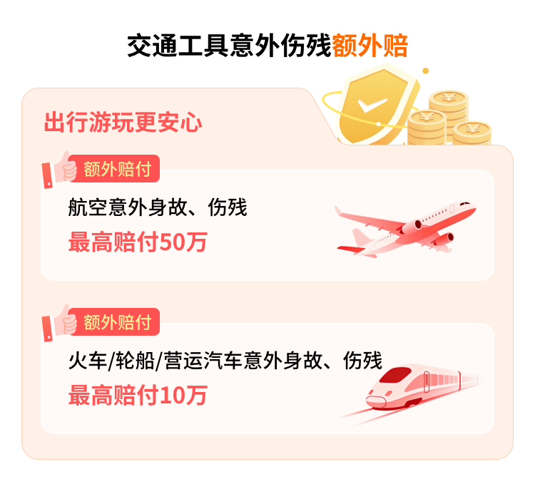 | 轮船意外身故、残疾 | 10万元 | 被保险人以乘客身份乘坐商业营运的轮船期间因遭受意外伤害事故,并自事故发生之日起一百八十日内因该事故身故的,保险公司以“轮船意外伤害保险金额”为限给付事故对应的身故保险金,对被保险人的保险责任终止;因该事故造成《人身保险伤残评定标准及代码》所列伤残之一的,保险公司按该表所列给付比例乘以“轮船意外伤害保险金额”给付事故对应的伤残保险金。 |