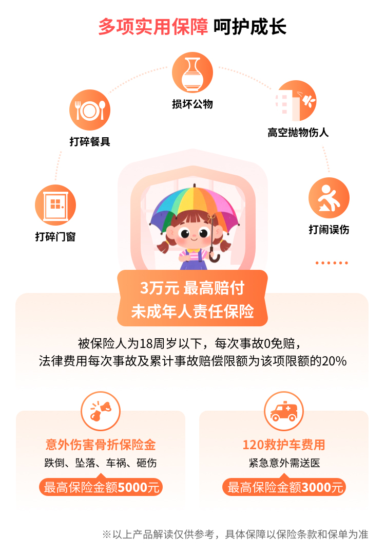 | 未成年人责任(只保至18周岁以下) | 1万元 | 保险期间内,被保险人(被保险人本人为未成年人)因过失造成第三者人身伤亡或财产直接损失的,依照中华人民共和国法律(不包括港澳台地区法律)应由被保险人监护人承担的经济赔偿责任,保险公司根据本保险合同的约定负责赔偿。保险事故发生后,被保险人或其监护人因保险事故而被提起仲裁或者诉讼的,对应由监护人支付的仲裁或诉讼费用以及事先经保险人书面同意支付的其他必要的、合理的法律费用,保险公司按照本保险合同约定也负责赔偿。(每次事故0免赔;法律费用每次事故及累计事故赔偿限额为该项限额的20%) |