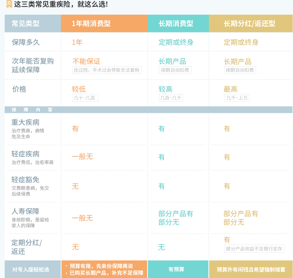 如预算不紧张,长期消费型产品是首选;适当搭配1年期产品,充足保障;若有闲钱,也可考虑分红/返还型。