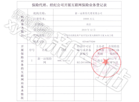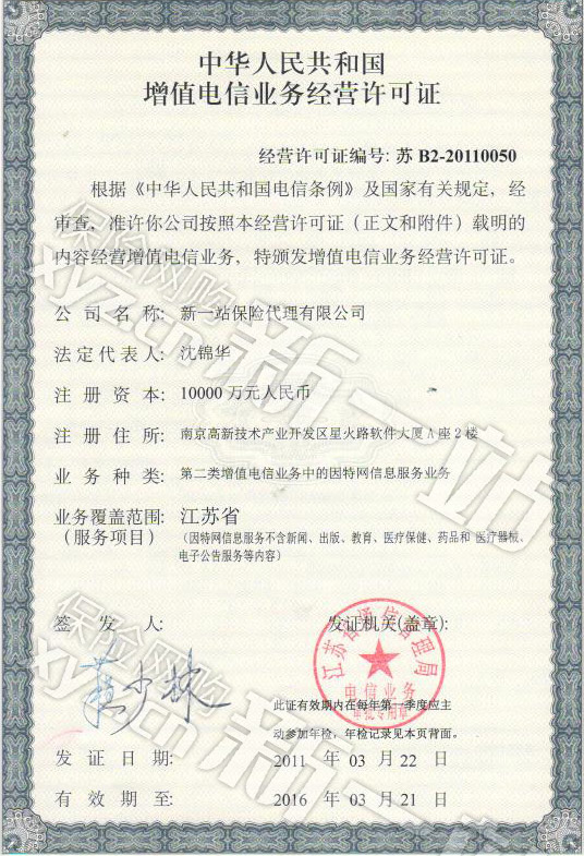新一站保险网在2011年3月22日获得通信管理局认可在通信主管部门完成网站备案,电信增值业务许可证为:苏B2-20110050,网站接入地在中华人民共和国境内。