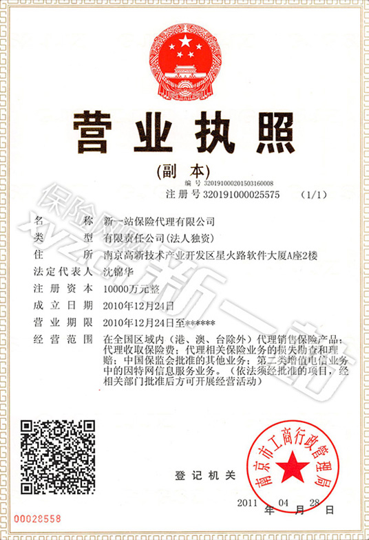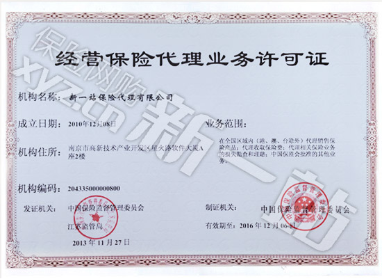 新一站保险代理有限公司于2010年12月7日获得银保监会批准设立,并颁发业务许可证(证件号码:204335000000800),业务经营区域涵盖整个中国大陆注册资本高达10000万元人民币。